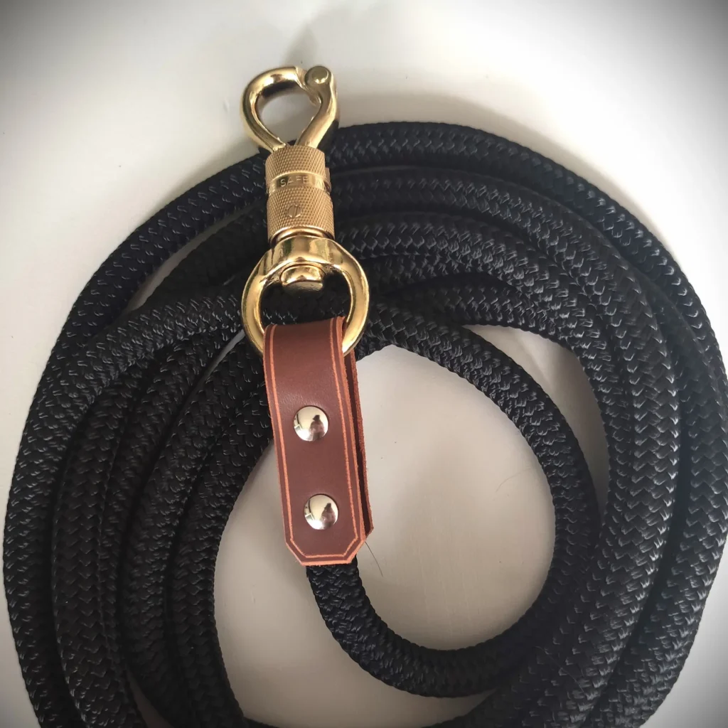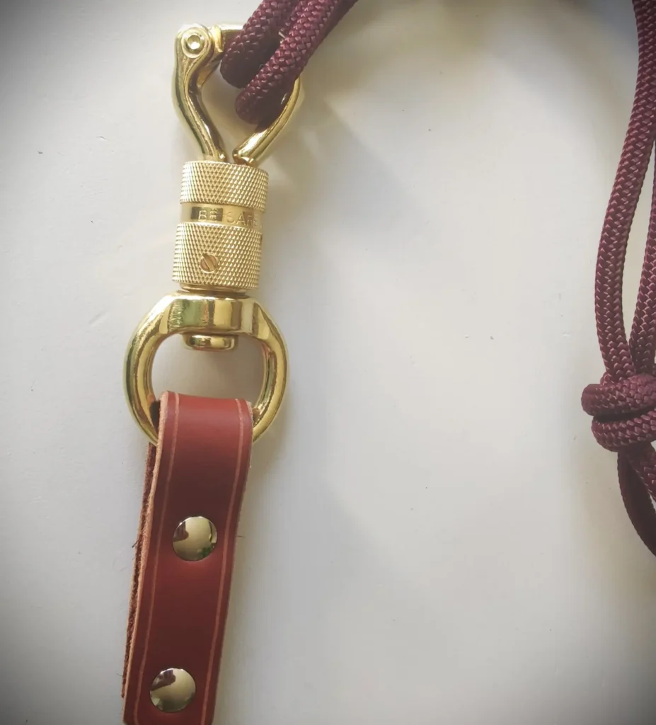- Avec mousqueton de sécurité en laiton : plus lourd, il permet de verrouiller le mousqueton pour une sécurité renforcée. Son principal avantage ? Son poids, idéal pour un meilleur contrôle. Fabriqué également avec le montant en cuir et rivets vis, cependant, vous pouvez opter pour une autre option de couture donc sans le montant en cuir, il suffit de le signaler.