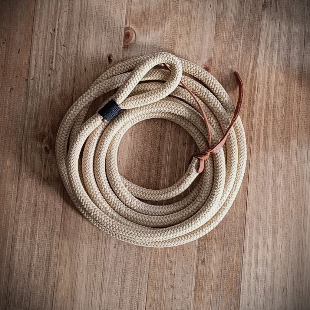 La corde sélectionnée assure la bonne résistance dans le temps. Son diamètre est de 14mm. Son poids est idéal, il permet d’ être fin et précis dans les demandes en faisant des petits mouvements léger pour une phase 1, 2 ou d’amplifier les ondulations en phase 3 ou 4. Lorsque le cheval cède et que l’on cesse instantanément notre demande, la corde redevient droite. Cette longe répond parfaitement aux demandes !